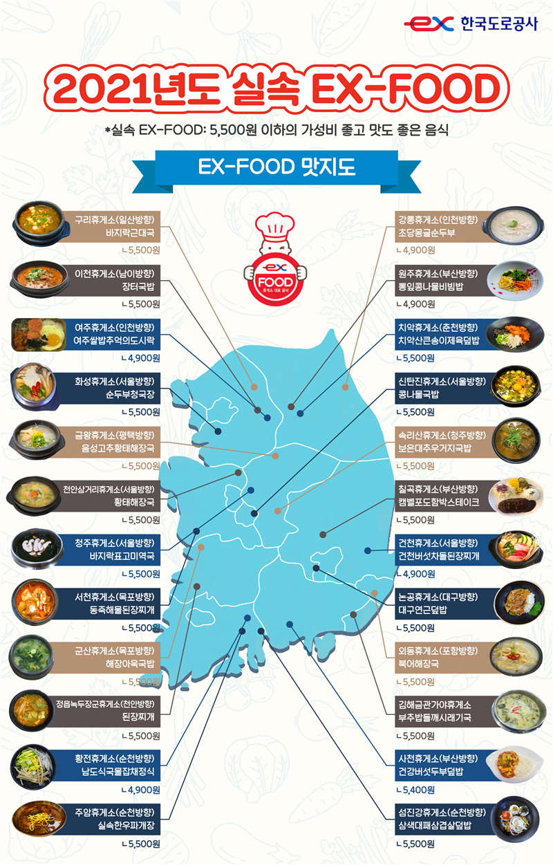 □ 한국도로공사(사장 김진숙)는 맛이 좋고 가격이 합리적인 ‘실속 EX-FOOD’ 24개를 선정했다고 밝혔다.