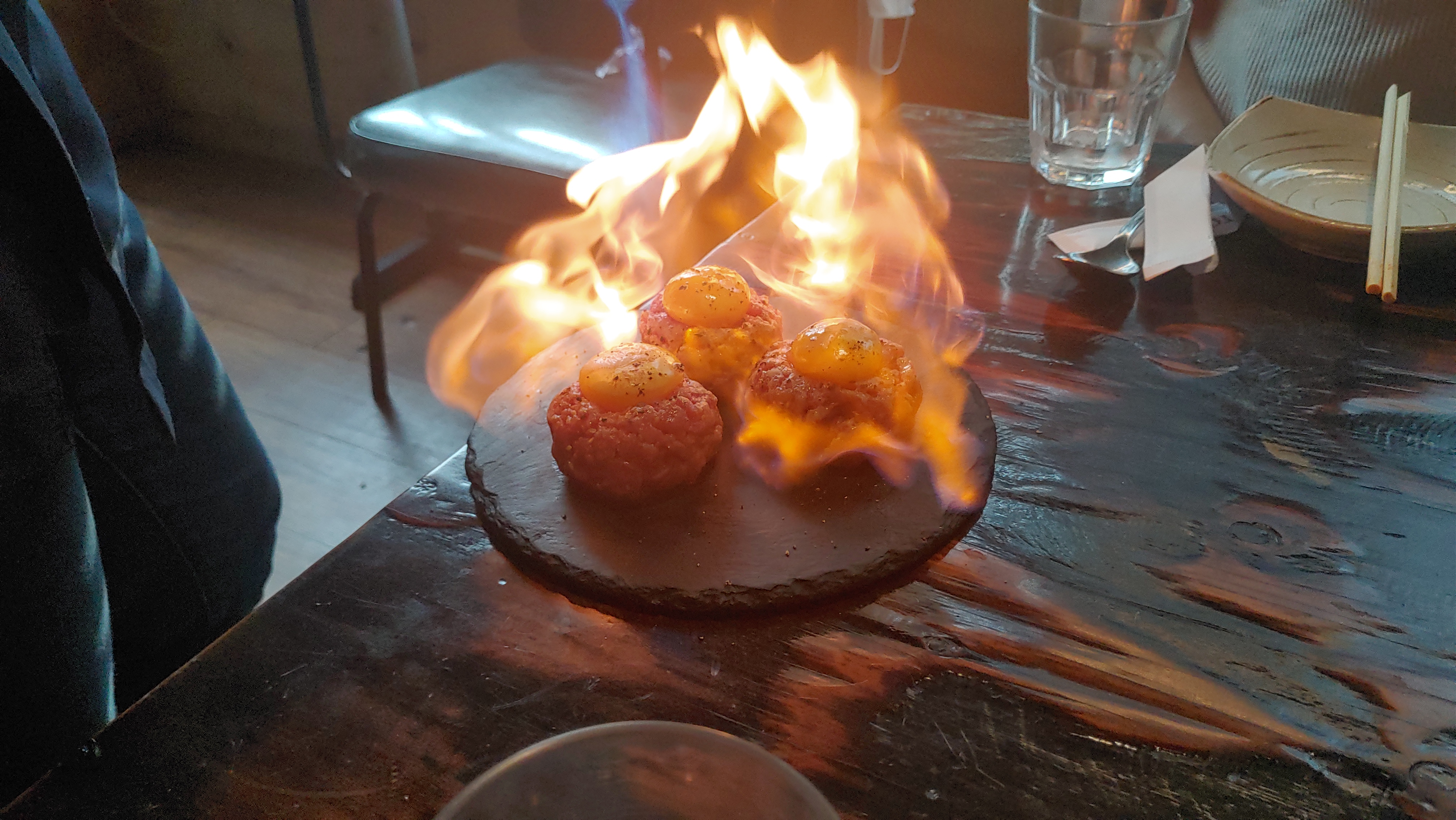 간단한 설명과 함께 화려한 토치 불쇼를 보여주셨습니다. 일행이 조금 놀랐던건... 그냥 아무 생각없이 내용을 읽지도 않고 육회만 보고 시킨터라.