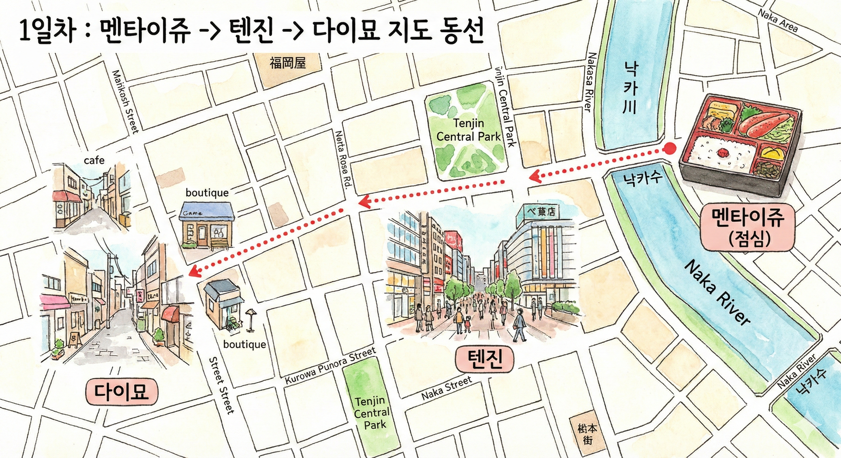 - 1일차: 공항 도착 → 멘타이쥬(이른 점심) → 텐진 지하상가 & 미나텐진 → 다이묘 거리 (스투시 / 몽벨) → 대동원(야키니쿠) → 캐널시티 & 하카타 일루미네이션