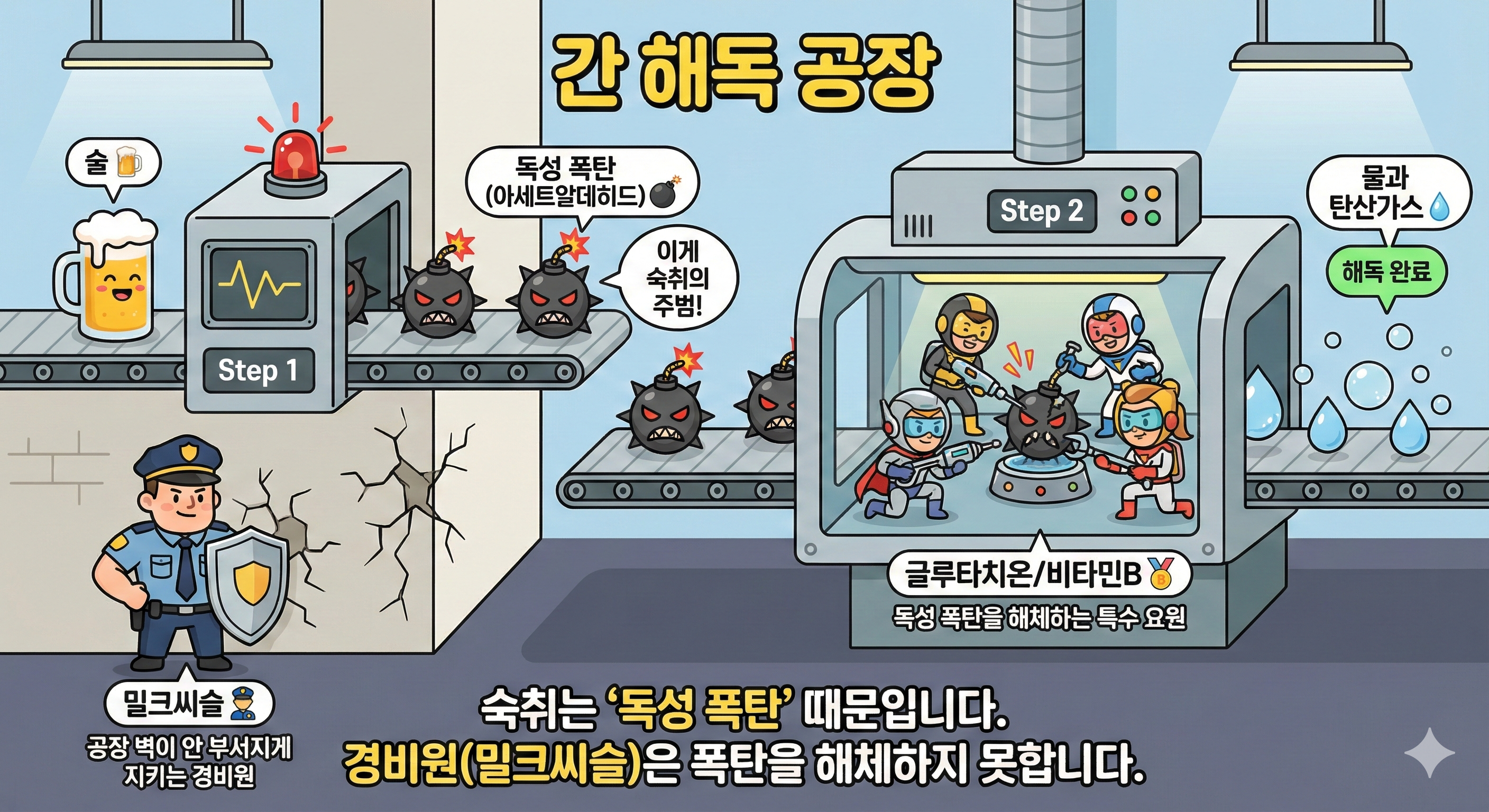 즉, 술을 빨리 깨려면 경비원(밀크씨슬)이 아니라 특수 요원(글루타치온, 비타민B)을 투입해야 합니다.