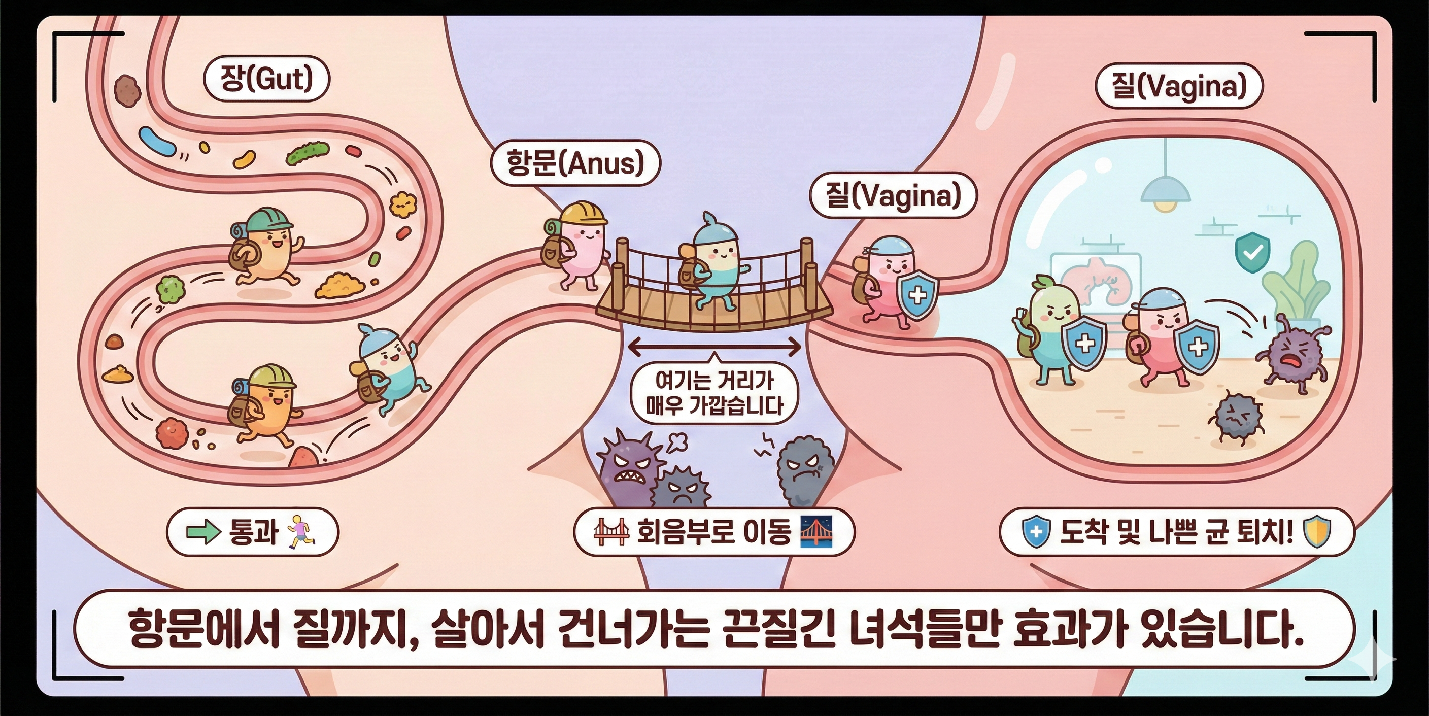 일반 유산균이 장에서 끝난다면, 질 유산균은 [입 → 장 → 항문 → 회음부 → 질] 이라는 험난한 여정을 거쳐 질 내부에 정착해야 합니다. 그래서 반드시 '질 내 정착이 검증된 균주(UREX 등)를 드셔야 합니다.